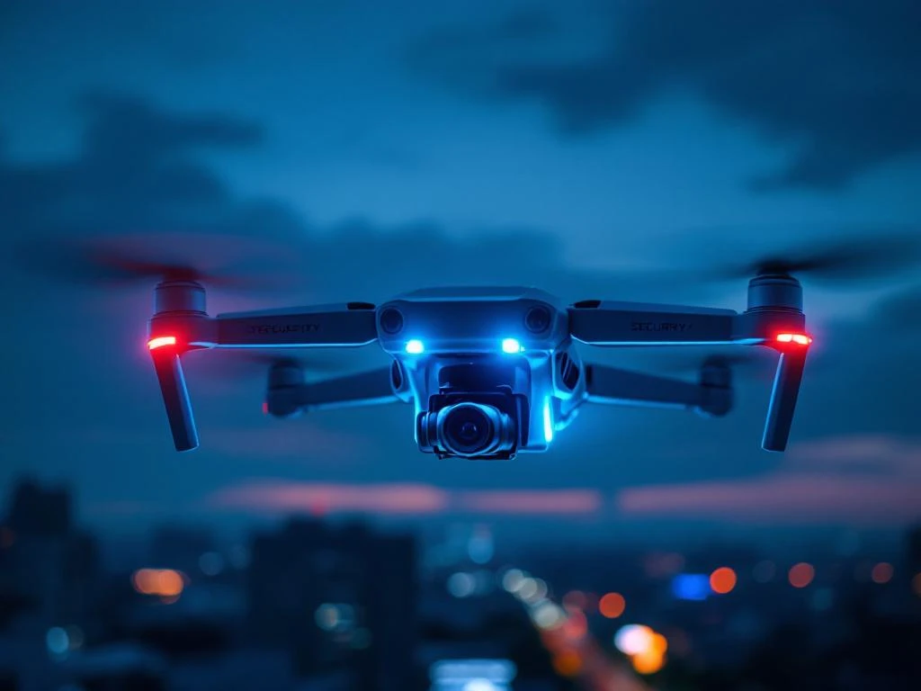 Moderne beveiligingsdrone met LED-verlichting zweeft boven verlichte stad tijdens schemering