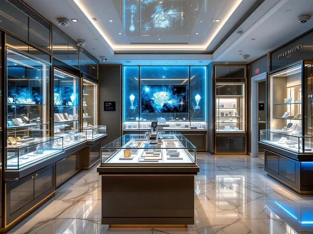 Luxe juwelierszaak interieur met beveiligde vitrines, camera's, sensoren en diamanten achter kogelvrij glas